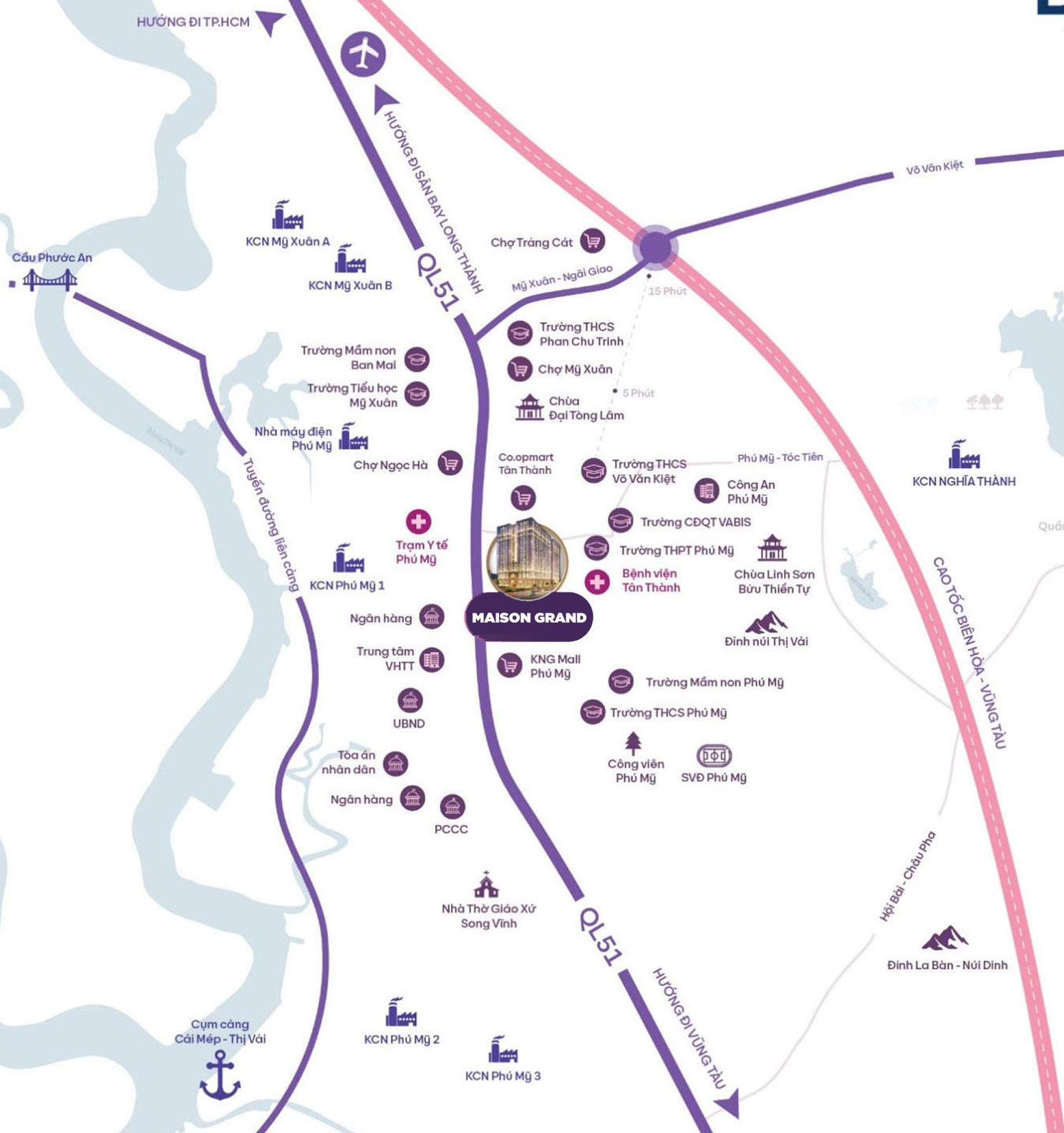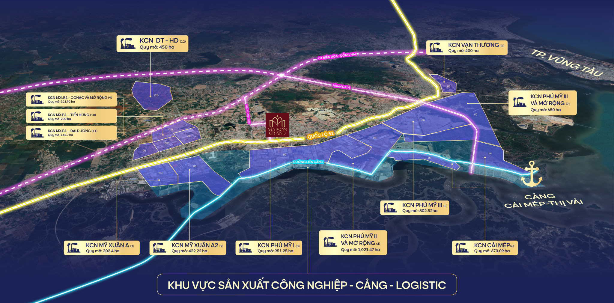 Dự án Maison Grand Phú Mỹ, tọa lạc tại trung tâm cảng Phú Mỹ, khu vực trọng điểm trong phát triển công nghiệp – logistics – thương mại của tỉnh Bà Rịa Vũng Tàu. Từ MAISON GRAND, cư dân dễ dàng kết nối: