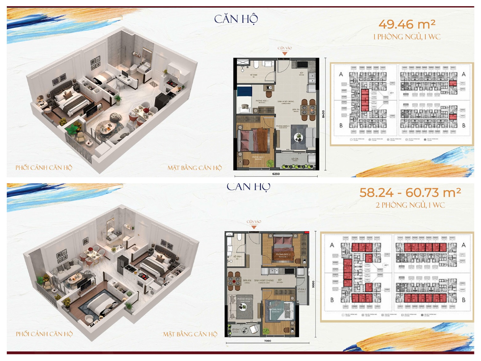 - Căn hộ 1 phòng ngủ (1PN): 48,98 m² – phù hợp cho người độc thân hoặc gia đình nhỏ.