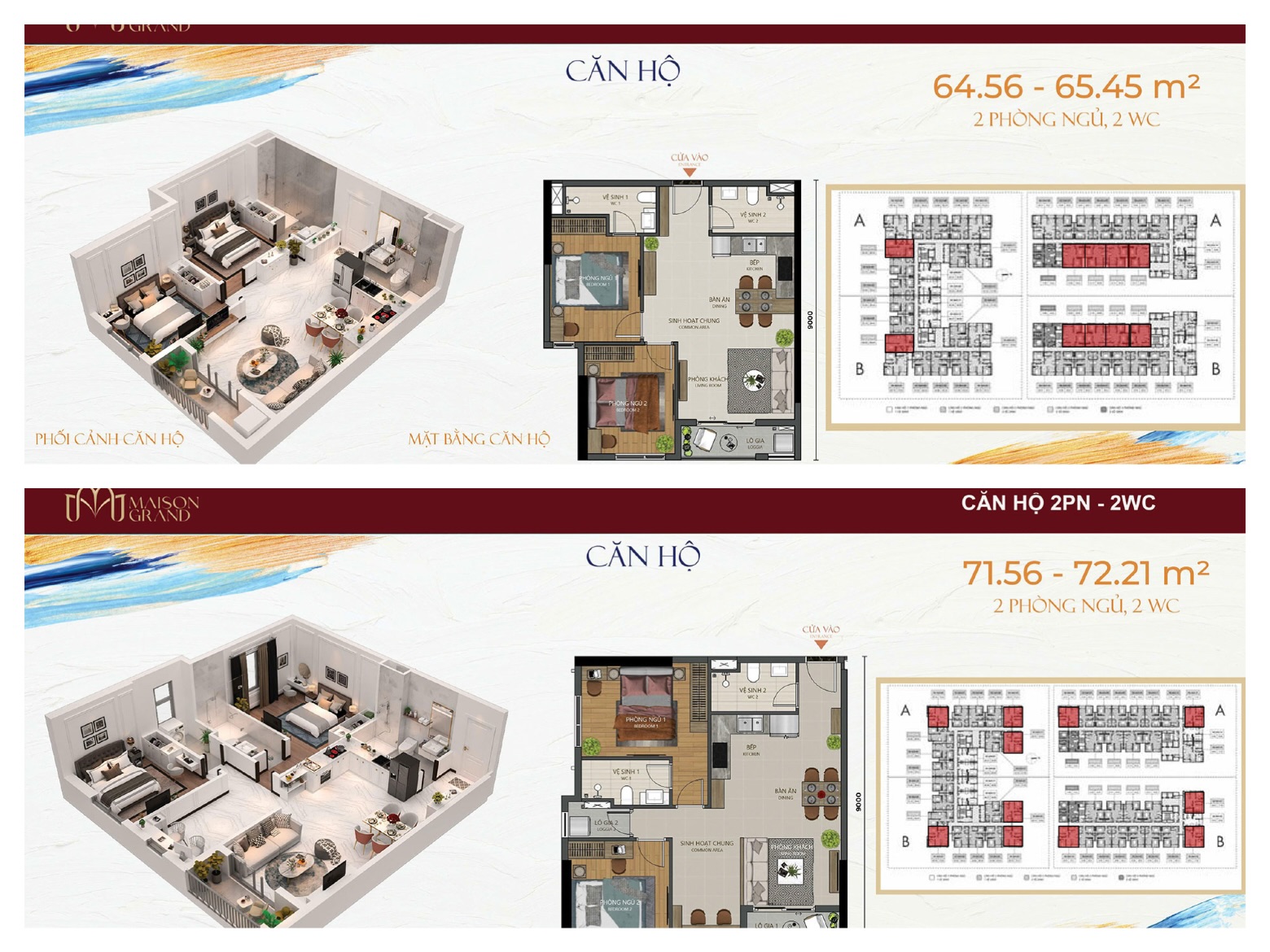 - Căn hộ 2 phòng ngủ (2PN): 65 m² – 72,21 m² – tối ưu không gian sống cho gia đình trẻ.