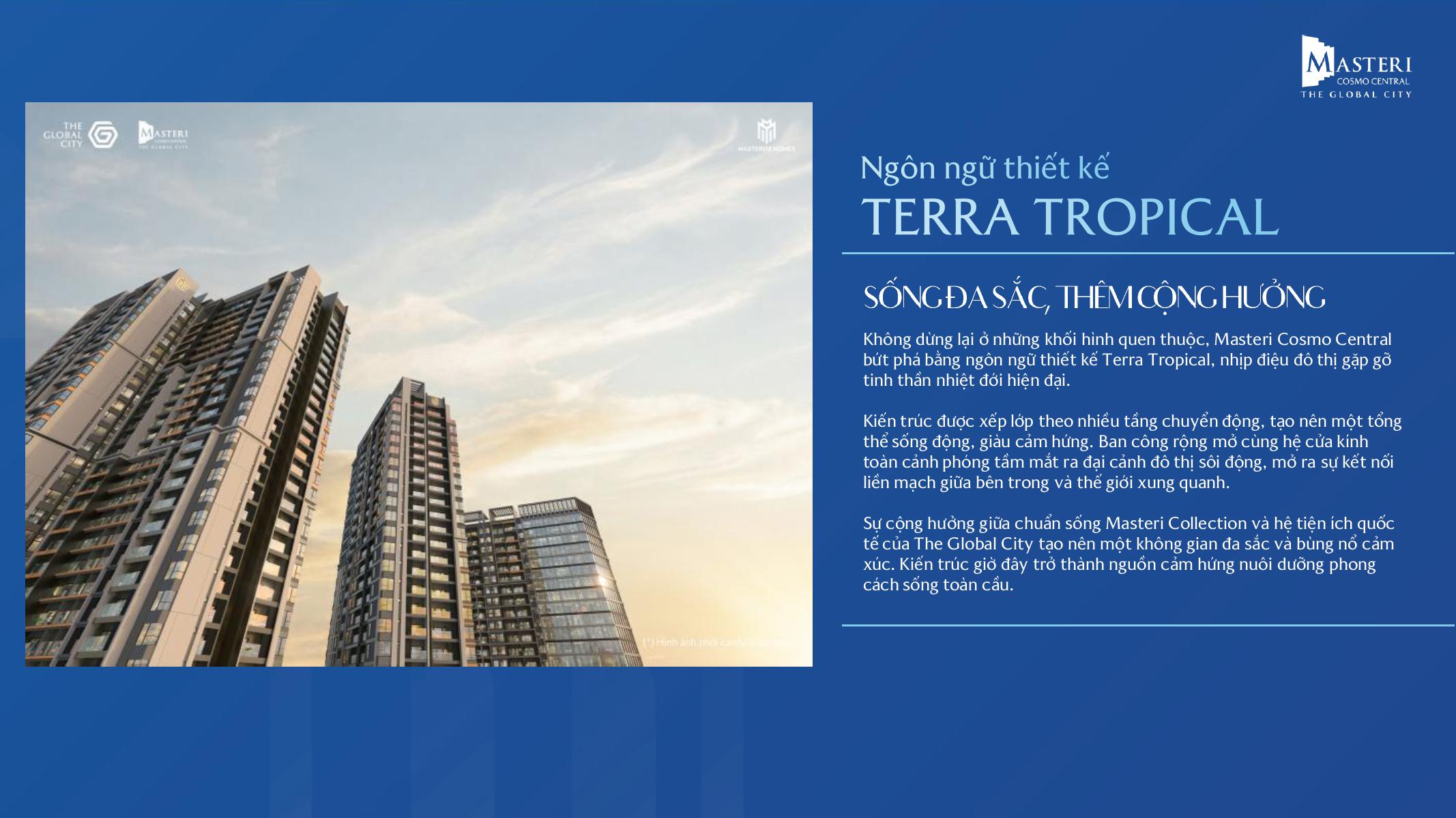 Dự án nổi bật với ngôn ngữ thiết kế Terra Tropical – sự giao thoa giữa kiến trúc đô thị hiện đại và tinthần nhiệt đới phóng khoáng: