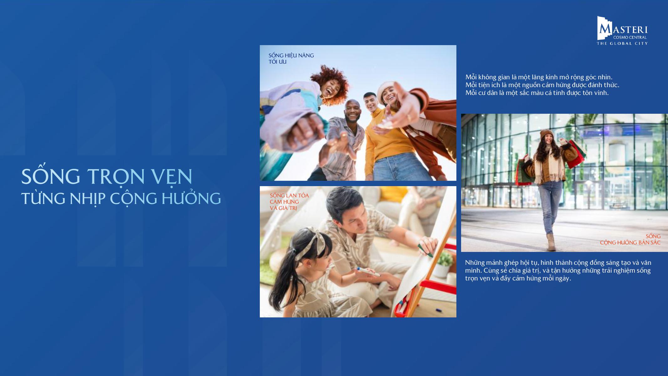 Mỗi khoảnh khắc sống tại Masteri Cosmo Central đều mang ý nghĩa – nơi cư dân tìm thấy sự kết nối với bản thân, gia đình, cộng đồng và nhịp phát triển của thành phố toàn cầu.