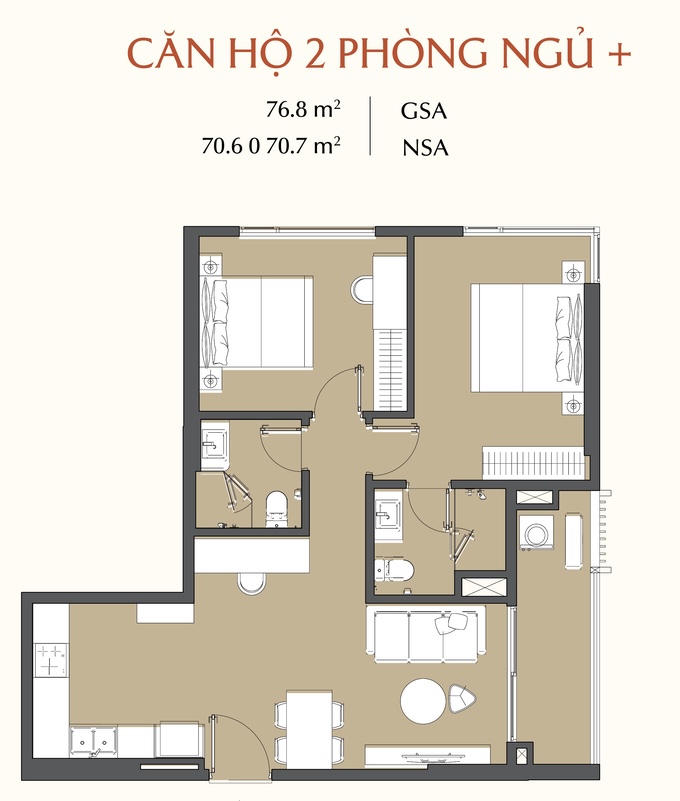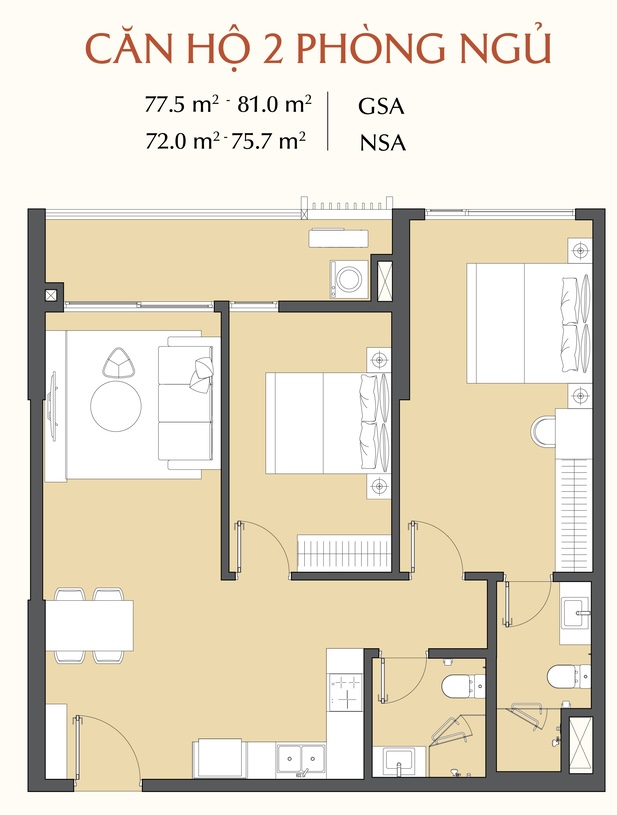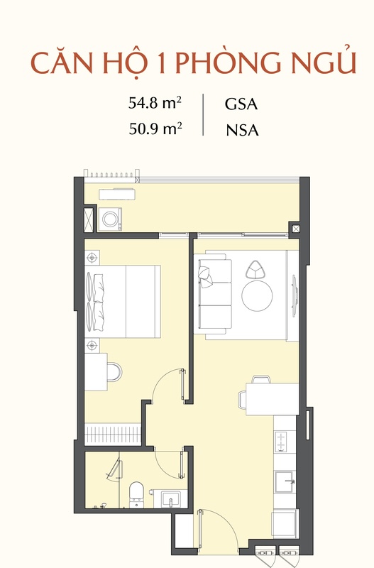 - Căn hộ 1PN – 2PN – 3PN: diện tích từ 50,9m² – 109,1m²